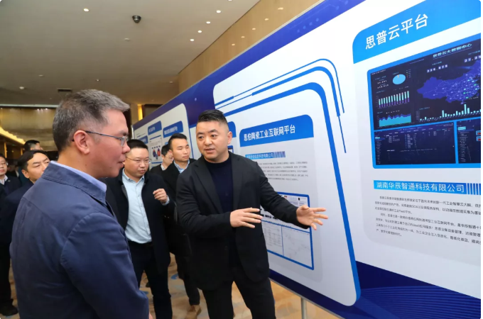 • PA国际官网智通总经理傅帝向湖南省工业和信息化厅党组书记、厅长曹慧泉介绍思普云在工业领域应用情况